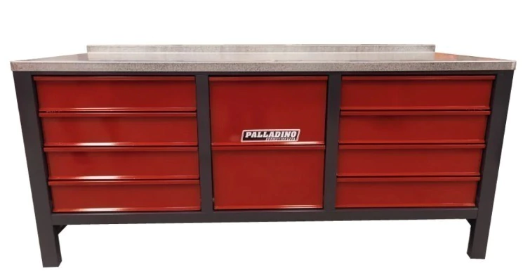 El banco de trabajo Palladino de 2 metros con 10 cajones es la estación de trabajo definitiva para talleres de máxima exigencia. Combina una superficie de apoyo extra amplia con una capacidad de almacenamiento masiva, permitiendo organizar todo el herramental de mano y realizar tareas pesadas en un solo lugar robusto y profesional.