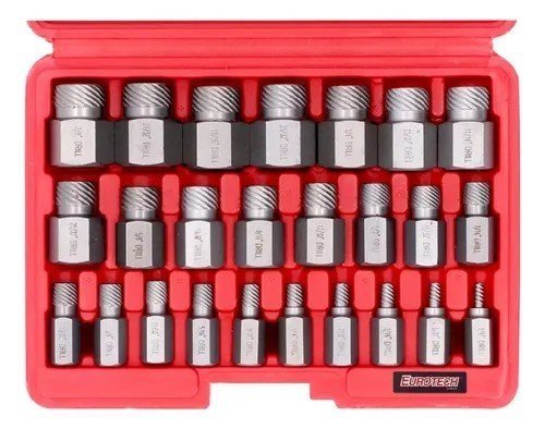 El set más completo para la remoción de pernos, tornillos, espárragos y extremos de tuberías dañados. Este kit de 25 piezas es una solución definitiva para el taller, permitiendo extraer piezas descabezadas, oxidadas o barridas sin dañar las roscas originales de la base.