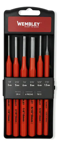 El juego de punzones saca espiga Wembley 7813 es una herramienta de precisión indispensable para mecánicos, armeros y técnicos de mantenimiento industrial. Diseñados específicamente para remover pasadores, espigas y pernos elásticos de forma segura y controlada, estos punzones están fabricados en Acero de Alta Resistencia, garantizando que no se deformen ni se quiebren bajo impactos repetitivos.