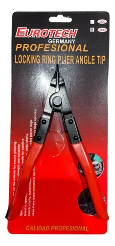 Herramienta especializada con puntas en ángulo, diseñada para la extracción e instalación de anillos de seguridad sin ojal (seguros elásticos planos) en lugares de difícil acceso. Su diseño permite sujetar seguros en posiciones donde una pinza recta no tiene espacio de maniobra, siendo vital para el desarmado de transmisiones y cajas de velocidad.