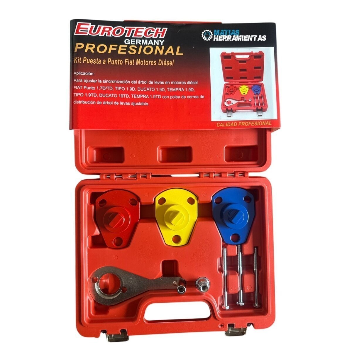 El Kit de Puesta a Punto Bremen 6844 es una herramienta de precisión indispensable para la sincronización de motores Diesel de la línea Fiat. Este conjunto de bloqueadores permite fijar el cigüeñal y el árbol de levas en su posición exacta, garantizando que el reemplazo de la correa de distribución se realice de forma técnica y segura, evitando daños costosos en las válvulas.