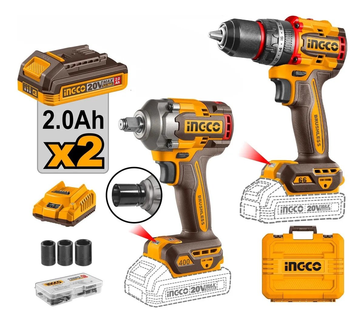 🔧 KIT TALADRO PERCUTOR + LLAVE DE IMPACTO 20V INGCO (CKLI20275-4)